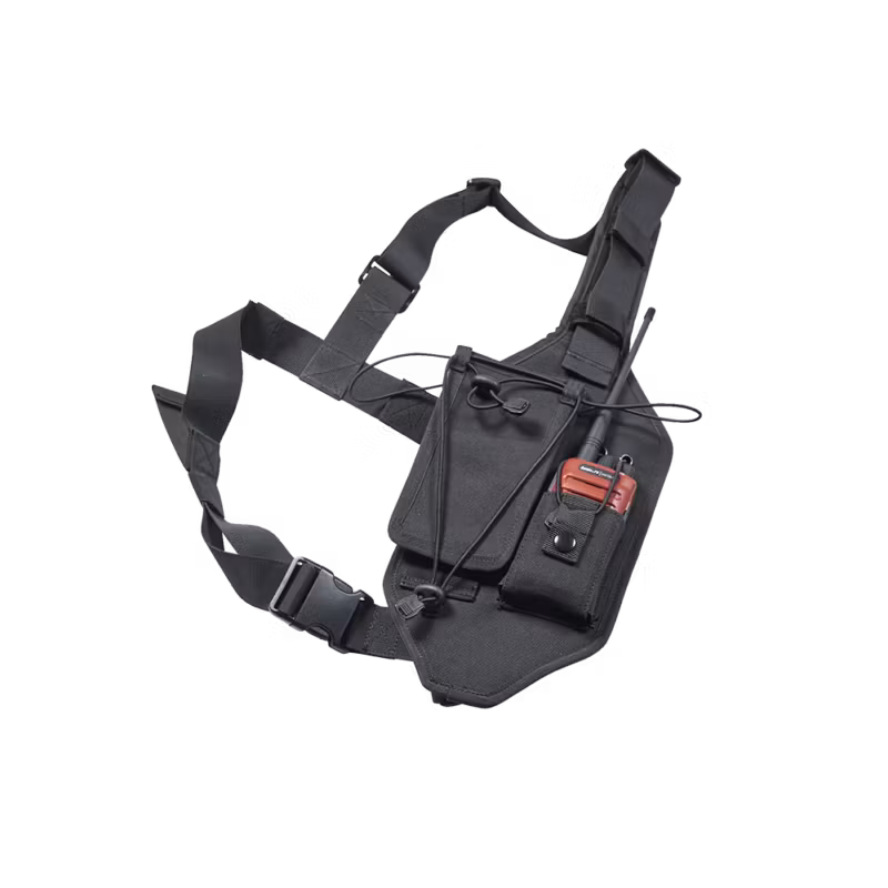 Hunters radiosele för jaktradio och GPS har reglerbar rygg och enkla spännen samt är anpassad så den passar både höger- och vänsterskyttar.Hållarna är elastiska, så de passar för de flesta modeller av radio och GPS. GPS-hållaren är vikbar, så det är kan vara utfälld och det därmed är lätt att ha ett öga på GPS-en. Kardborregömma för kabeln till öronmusslan. Fäste för skogsantenn.